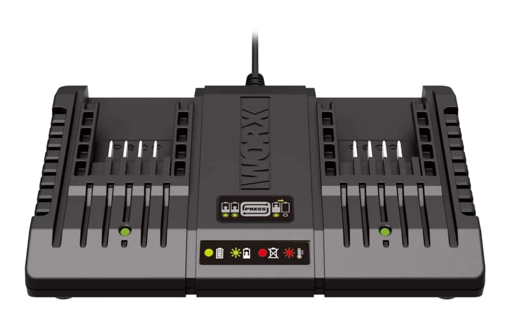 - Worx 20V Dual Port Charger can charge two 20V batteries in 2 hours or one battery quickly on its own